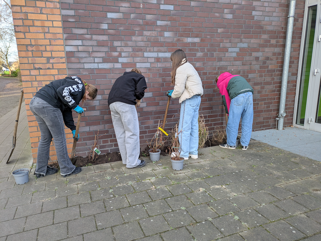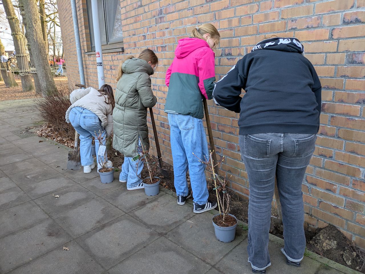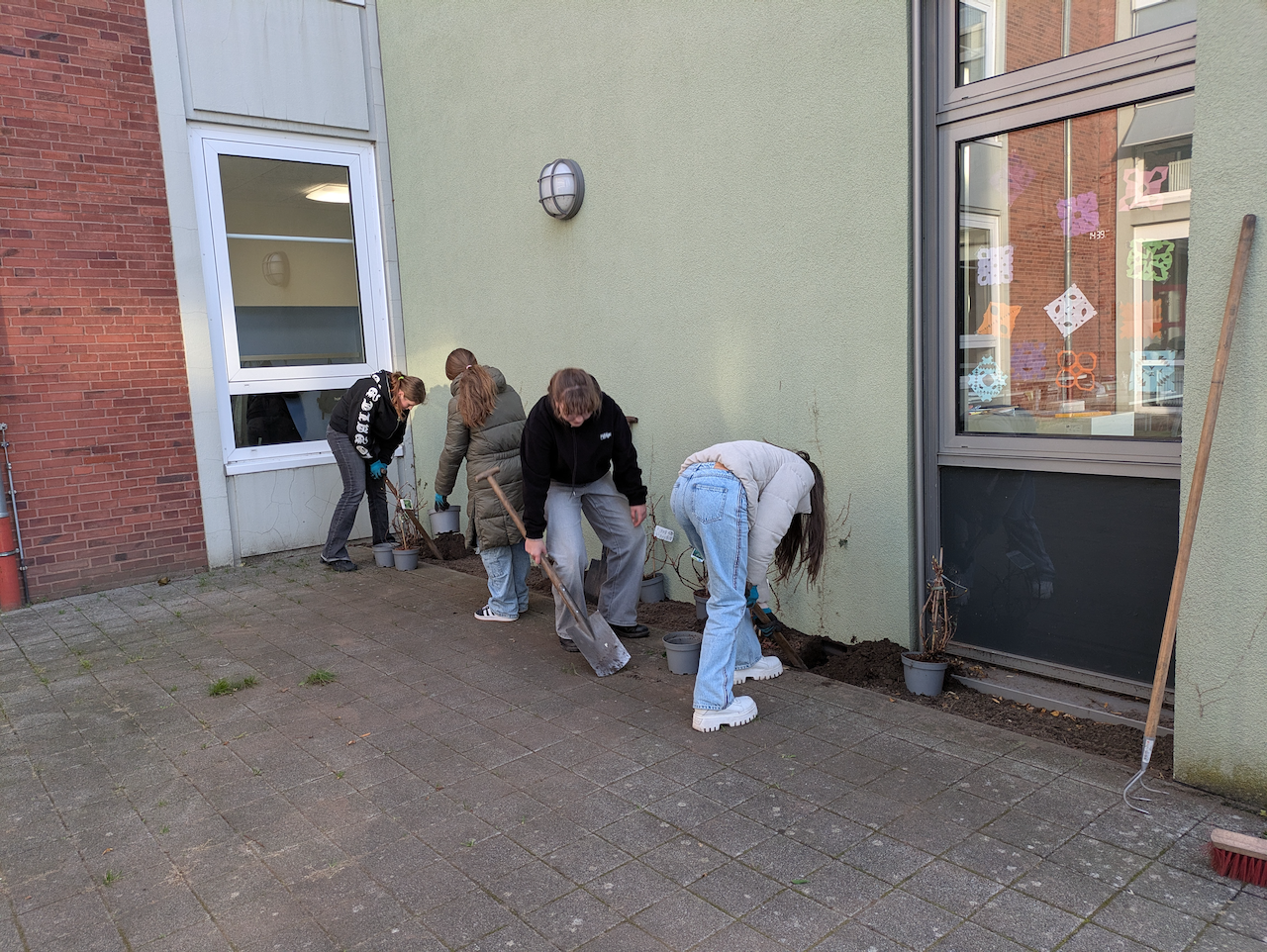 So wurden in einem ersten Einsatz Anfang Oktober kurz vor den Herbstferien durch eine achte Klasse 120 Efeupflanzen an einigen Wänden des Oberstufentraktes gepflanzt. Nun wurde das Projekt kurz vor den Weihnachtsferien durch die Biotop-AG des Martinums, die von der Biologielehrerin Bianca Schlarmann betreut wird, erfolgreich abgeschlossen. Durch die Schüler*innen bepflanzt wurden Wände des Oberstufentraktes, der Mensa, der Sporthalle, am Lehrerparkplatz und im Schulbiotop. Zur Vergrößerung der Artenvielfalt wurden dieses Mal Ketterhortensien, Chinesischer Blauregen, Ramblerrosen und Wilder Wein gesetzt, deren Blüten Nahrung für Insekten liefern, die wiederum eine Nahrungsquelle für unterschiedliche Singvogelarten darstellen. Dabei wurde auf unterschiedliche Blühzeiten geachtet. So liegt der Beginn der ersten Blüte des Chinesischen Blauregens Anfang Mai, während Efeu mit seiner späten Blüte im Oktober November die letzte überlebenswichtige Nahrungsquelle für die Insekten vor dem Einbruch des Winters darstellt. Darüber hinaus wird die Zukunft zeigen, wie sich angesichts des Klimawandels die Fassadenbegrünung auf die Temperatur in den Klassenräumen im Winter und im Sommer auswirkt. Erste Forschungsergebnisse belegen im Sommer einen deutlich kühlenden, im Winter einen erkennbar dämmenden Effekt. Darüber hinaus wurde in einem Forschungsprojekt der Uni Köln nachgewiesen, dass insbesondere Efeu, das nach gängiger Meinung eine gebäudeschädigende Wirkung hat, nicht nur das den Klimawandel fördernde Gas Kohlenstoffdioxid absorbiert, sondern auch gesundheitsschädliche Stickoxide, z,,B, aus Autoabgasen, und zudem auch Feinstäube aus der Luft herausfiltert. (https://uni-koeln.de/universitaet/aktuell/meldungen/meldungen-detail/begruente-fassaden-in-den-staedten-helfen-gegen-feinstaub-stickoxide-und-hitze )