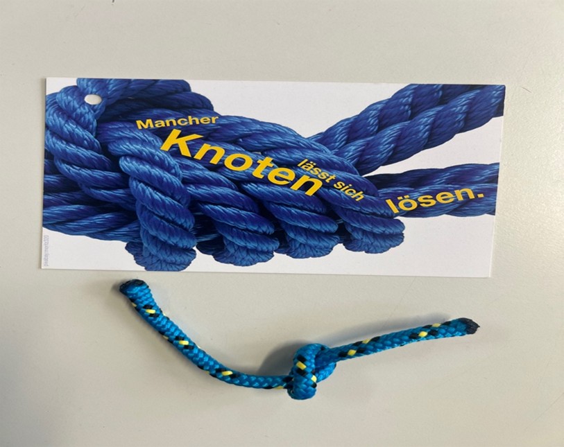 Wir fanden es sehr interessant und spannend, mit einer Mitarbeiterin der Diakonie über ihre alltägliche Arbeit zu sprechen. Uns war vorher auch gar nicht klar gewesen, dass auch wir schon, ohne unsere Eltern oder andere erwachsene Begleitpersonen, die Hilfe der Diakonie in Anspruch nehmen dürfen. Die verknoteten Seile begleiten manche von uns – liegen auf dem Schreibtisch zu Hause oder sind im Schulmäppchen – und erinnern uns daran, dass die Diakonie eine Anlaufstelle sein kann, wenn es ein größeres Problem zu entwirrren gilt.
