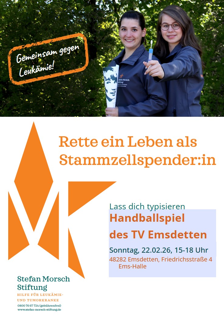 Am Sonntag vorher besteht ebenfalls schon die Möglichkeit für die Abgabe einer Speichelprobe. Der TVE als Kooperationspartner des Martinums bietet im Rahmen des Handballspiels der A-Jugend GREEN ACADEMY eine Typisierungsaktion in der Emshalle an. Weitere Informationen sind dem beigefügten Plakat zu entnehmen.