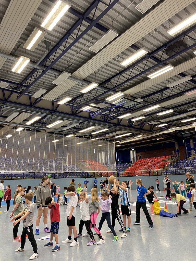 Am 25.01.2024 fand das alljährliche Hallensportfest der Kardinal von Galen Grundschule in der Emshalle statt. Herr Weidner, der momentan auch an der Grundschule tätig ist, und Frau Gerlach planten hierfür eine Kooperation, die möglicherweise der Anfang einer langfristigen Zusammenarbeit sein könnte.